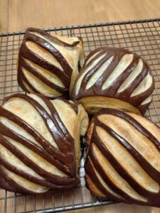 こちらは、今月の特別レッスン「パン・オ・ショコラ」なのですけどー、2次発酵をゆーーーーーーーーーっくり室温で過ごしたパンさんです。出かける用事があったのでー、まぁ、この時期なら3時間程度大丈夫だろうと思い、お家に帰ってみるとまだまだ大丈夫、すこーし発酵が進んだかなぁという段階でしてー、そこから2時間程度約20℃ぐらいの室温で発酵させ焼いたものでございます。やはり!折込生地は、ゆっくりがベスト!と再確認したわけでございますー(≧◇≦)