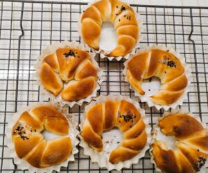 さてさて、こちらのお写真は、「塩バターロール」の小さい版でございます。大きくても小さくてもそれなりに成形が難しいのですがぁぁぁ。。詳しくは、12月のレッスンの時にお話ししますねー。ただ、、こちらの成形で大切なのは、いかに生地を張らせるかでございます!もちろん、もう少し簡単にできなくはないのですがー、それだと食感が変わってきてしまうのよねー。おばちゃん、自分で自分を追い込んでいる気もしますがー、やはり「味」が第1だと考える次第で。。ちょいと大きいよりはまだ、やりやすい小さい塩バターロールを蟹さんのようにしてみたよー。です!パンを作る上で「張らせる」ということがとっても重要でしてー、それでパンに力が生まれー、食感も違うのでございますよねー。